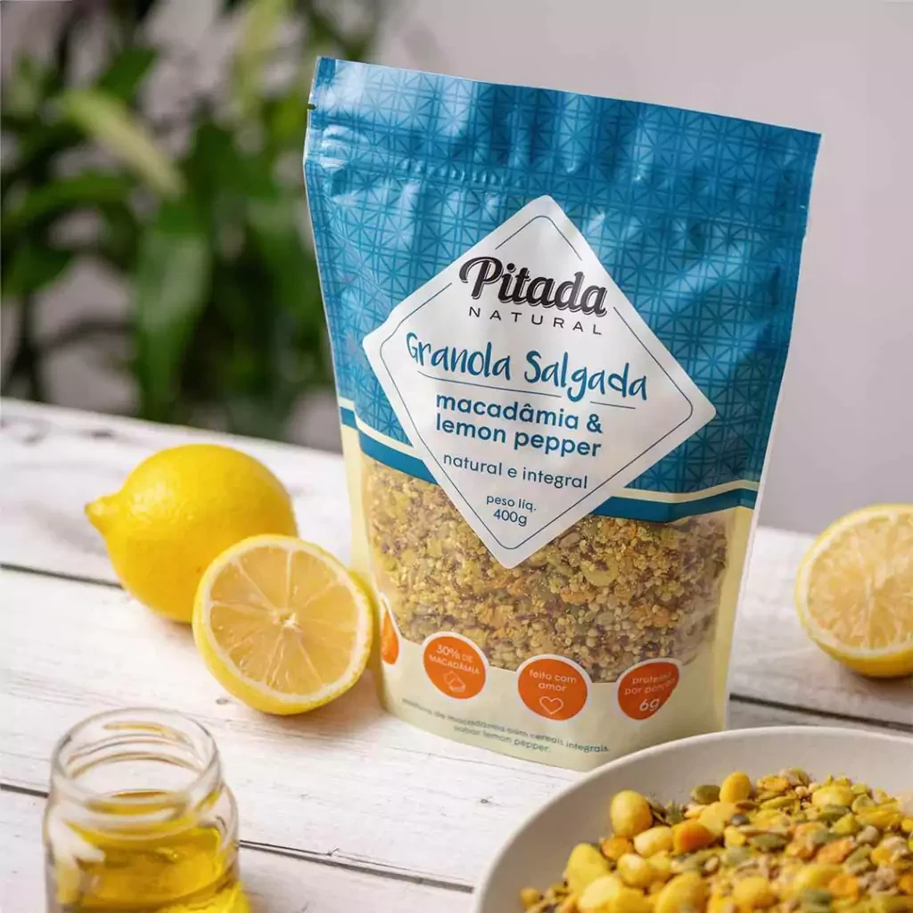 Macadâmia, semente de abóbora, semente de girassol, aveia integral, gergelim, linhaça, flocos de milho, quinoa em flocos, azeite de oliva extravirgem, flocos de arroz, tempero Lemon Pepper Pitada Natural (casca de limão siciliano, cebola, pimenta-do-reino, cúrcuma, alho, cebolinha, salsa, páprica doce, mostarda e acidulante natural ácido cítrico) e sal marinho.