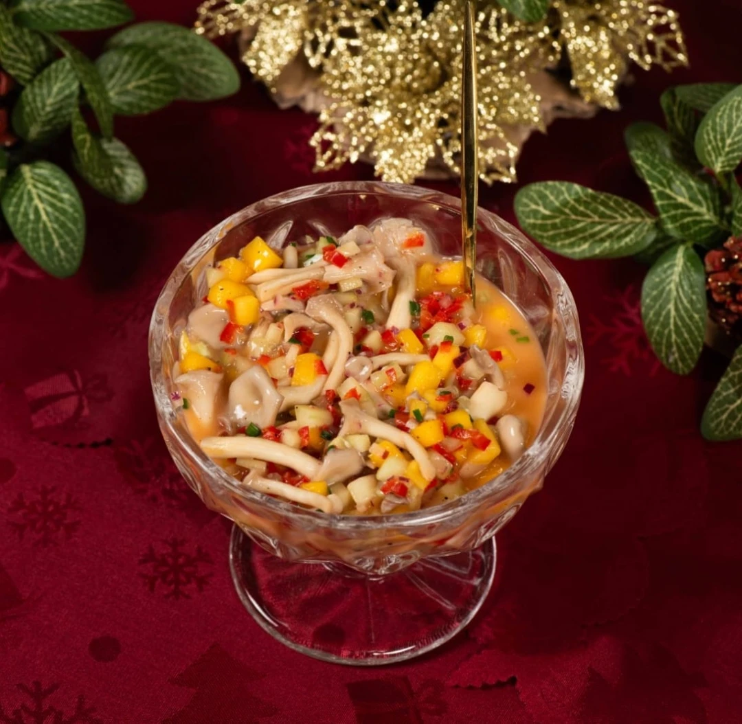 Shimeji fresco marinado com manga, pepino japonês, pimentão
