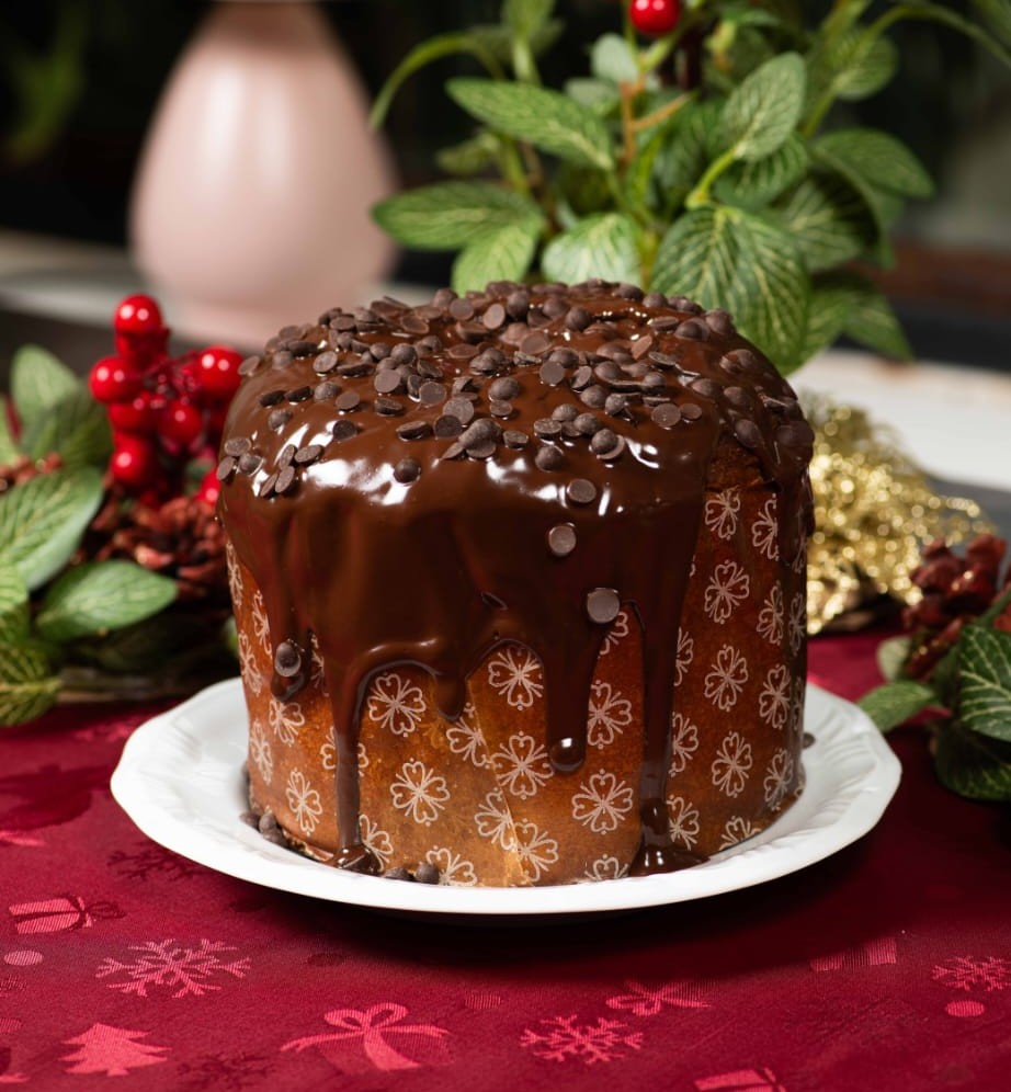 ESCOLHA O SABOR DE PANETONE OU CHOCOTONE PARA TRUFAR + recheio cremoso de creme de avelã vegano e cobertura de chocolate.