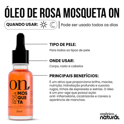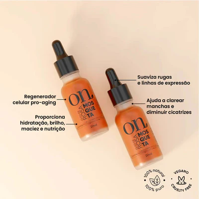 O Óleo de Rosa Mosqueta ON é um regenerador celular pro-aging que proporciona brilho, maciez, nutrição, hidratação profunda, suaviza rugas e linhas de expressão. Tem ação anti-inflamatória e cicatrizante. Estimula a produção do colágeno e restaura a elasticidade e firmeza da pele. Ajuda a clarear manchas, atenua cicatrizes e melhora o aspecto de estrias.