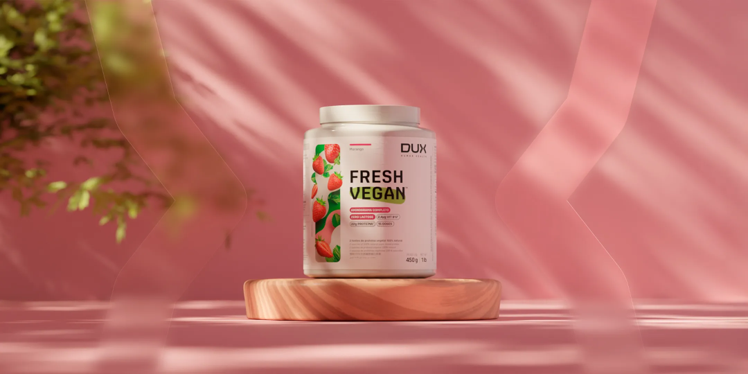 Nosso FreshVegan é uma proteína vegetal 100% natural, pura e limpa, com aromas e adoçantes naturais. Formulado com frutas de verdade e duas fontes proteicas - ervilha e arroz - oferece 22g de proteína por porção e um perfil de aminoácidos completo